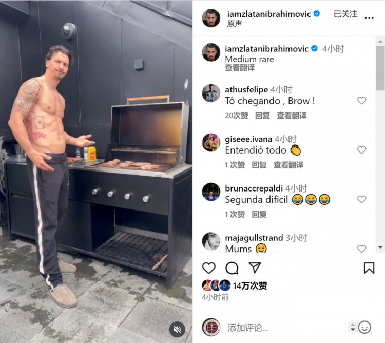 October 7th News Ibrahimovic updated his social media updates and posted a video of himself barbecue. Ibrahimovic posted a video of barbecue on his social media. The 44-year-old Swedish legendary star was naked and had obvious muscle lines. The caption was: "Five-point cooked."